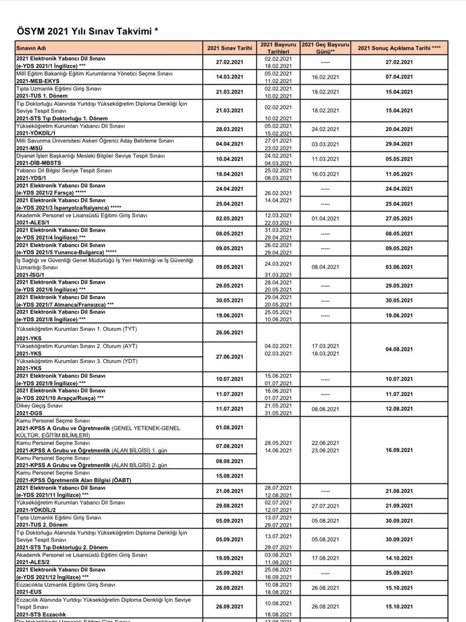 2021 yılında ÖSYM tarafından uygulanacak sınavların sınav tarihlerini, başvuru tarihlerini ve sonuç açıklama tarihlerini içeren 2021 Yılı Sınav Takvimi http://osym.gov.tr adresinden belli oldu.